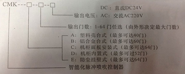 ??A:塑料殼臺式 1—40門 210x80x240(寬x高x深,單位為mm,以下相同) ??B:鋁合金臺式 2—16門 254x99x218 ?????????1 8—40門 319x109x228 ??c:機柑面板式 l—20門 外形尺寸:160x80x120 開孔尺寸:151x75.5 ?????????21—52門 外形尺寸:240x120x115 開孔尺寸:225x112 ??D:機柜內(nèi)罟式 1—20門 外形尺寸:155x110x110(采用導(dǎo)軌方式) ??????????????安裝尺寸:114x100(采用螺絲對接) ?????????21-52門 外形尺寸:300x110x110(采用導(dǎo)軌方式) ??????????????安裝尺寸:290x100(采用螺絲對接) ??E:防塵掛肇式 1—20門 外形尺寸:240x150x75(包括防水接頭) ??????????????安裝尺寸:202x149 ?????????21一56門 外形尺寸:264x210x95(包括防水接頭) ??????????????安裝尺寸:195x206 二.技術(shù)指標(biāo)和功能 ??1.輸入電壓:AC220V 50HZ ??2.輸出電壓:DC24V AC220V ??3.輸出電流:1A ??4.輸山同路:1—64門 ??5.脈沖間隔可調(diào):1—99秒(特殊情況可根據(jù)用戶另行設(shè)計) ??6.脈沖寬度可調(diào):0.1—9.9秒(正常調(diào)試為:0.2一0.5秒,特殊情況可根據(jù)用戶另行設(shè)計) ??7.環(huán)境溫度:一10℃一十55℃ ??8.兩位數(shù)字最示和5只指不燈:用于顯示控制器工作狀態(tài)。 ??9.步進和復(fù)吹功能:作為人人工檢查脈沖電磁閥用。 ??10.定時/差壓兩種清狄摔制方式仟選。 ??11.差壓控制輸入:為一對無源觸點。 三.安裝接線 ??CMK系列脈沖噴吹控制器采用接線端子的連線方式,標(biāo)示“L N”接交流AC220V電源,相線L和零線N不能搞錯,“FG”為接地線,接地線一定要接好。(脈沖電磁閥任何一根引出線接在控制器上每一門相應(yīng)的接線端子上,另一根引出線接在控制器上標(biāo)示“公共線”接線端子上)。(CMK-E型脈沖控制器接線要找開前蓋,電磁閥引線穿過防水接頭孔按上述接線)。如采用差壓控制方式,將差壓控制器的三根輸出信號線(開關(guān)信號)接至脈沖噴吹控制器的壓差開關(guān)二個接線端子上。當(dāng)除塵器的進出口差壓達到設(shè)定值時(差壓接點導(dǎo)通),噴吹控制器按順序進行噴吹清灰,直到差壓低于設(shè)定值(差壓接點斷開),才停止噴吹,然后等待下次差壓信號到來再啟動脈沖噴吹控制器進行噴吹。 ??如脈沖噴吹控制器使用在靜電噴涂設(shè)備時,噴涂工作室一定要接地線!!否則的話,噴涂工作室會帶有靜電,對操作工人存存安全隱患,還有可能會影響控制器的正常工作。