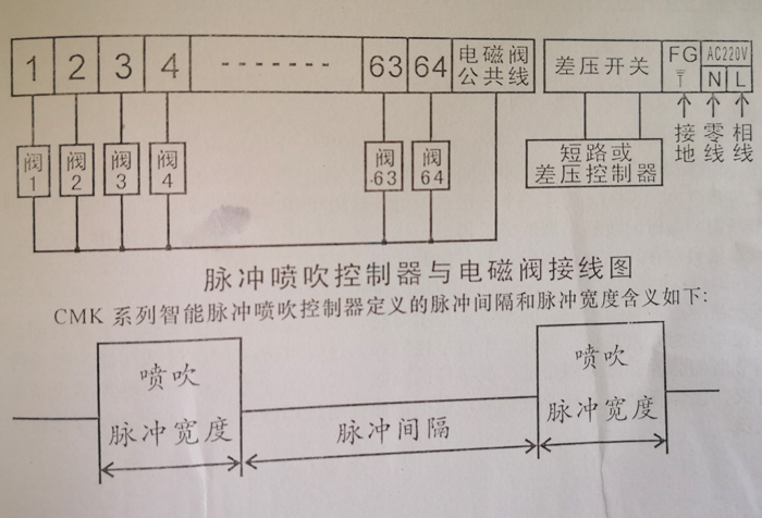 ??打開電源開關(guān), “24VDC”指示燈亮,顯示窗按順序l、2、3…周期性跳變。 ??1、脈沖間隔調(diào)節(jié): (是一個脈沖電磁悶與另一個脈沖電磁閥噴吹相隔時間)按一次《脈沖間隔》鍵,脈沖間隔指示燈亮,顯示窗顯示數(shù)值是脈沖間隔時間,數(shù)值幣付為“秒”,而且二個數(shù)字在閃爍,這時可按《加》鍵或《減》鍵進行調(diào)節(jié)所需間隔時間數(shù)值,調(diào)節(jié)好后再按一次《脈沖間隔》鍵,脈沖間隔指示燈滅,該數(shù)值自夸動存入脈沖控制器,如不按此鍵超過15秒后,也會自動存入脈沖控制器。 ??2、脈沖寬度調(diào)節(jié): (是每個脈沖電磁閥噴氣時間)按一次《脈沖寬度》鍵,脈沖寬度指示燈亮,顯示窗顯示數(shù)值是脈沖寬度時間,數(shù)值單位為幾點幾秒,而且二個數(shù)字在閃爍,這時可按《加》鍵或《減》鍵進行調(diào)節(jié)所需脈沖寬度時間數(shù)值,調(diào)節(jié)妤后再按一次《脈沖寬度》鍵,脈沖寬度指示燈滅,該值自動存入脈沖控制器,如不按此鍵超過15秒后,也會自動存入脈沖控制器。 3、復(fù)吹:如某組濾袋要多次噴吹清袋,按-次《復(fù)吹》鍵,復(fù)吹指示燈亮,此時就進入復(fù)吹狀態(tài),這時按《手進》鍵到某個脈沖電磁閥數(shù)子上,脈沖電磁閥就連續(xù)噴吹清袋,如要退出復(fù)吹狀態(tài),再按一次《復(fù)吹》鍵,復(fù)吹指示燈滅,脈沖控制器就按程序周期性正常工作。 4、手進:每按一次鍵,進程自動前進一步。 五.控制器的維護及故障維修 ??控制器采用高可靠的微機系統(tǒng)及集成電路,因此維護工作量極少。日常維護:應(yīng)避免陽光直射,注意防塵、防潮,盡量避免干擾源及強電磁場環(huán)境。電線應(yīng)保持清潔,注意干燥、確保絕緣,防止電纜線破損、斷裂。 ??如發(fā)現(xiàn)控制器有故障,可切斷電源3-5分鐘,再接通電源讓控制器重新工作。 ??如仍有故障,可按照下而的步驟進仃處理和維修。