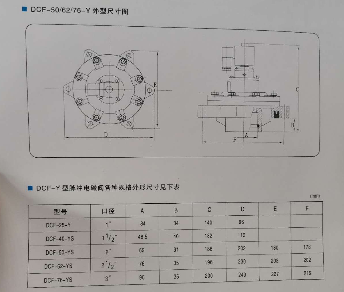 ??DCF-20/25/40/50/62/76-Y型系列型脈沖電磁閥為淹沒(méi)式閥(亦稱嵌入式閥),是袋式除塵器噴吹清灰主要裝置,向?yàn)V袋內(nèi)噴吹壓縮空氣開關(guān),受脈沖控制器輸出信號(hào)控制,對(duì)濾袋輪流噴吹清灰周期性工作,以保證除塵器達(dá)到收塵效率,它直接按裝在氣包上,有更好直通噴吹清灰效能。適用于氣源壓力范圍較寬場(chǎng)合。